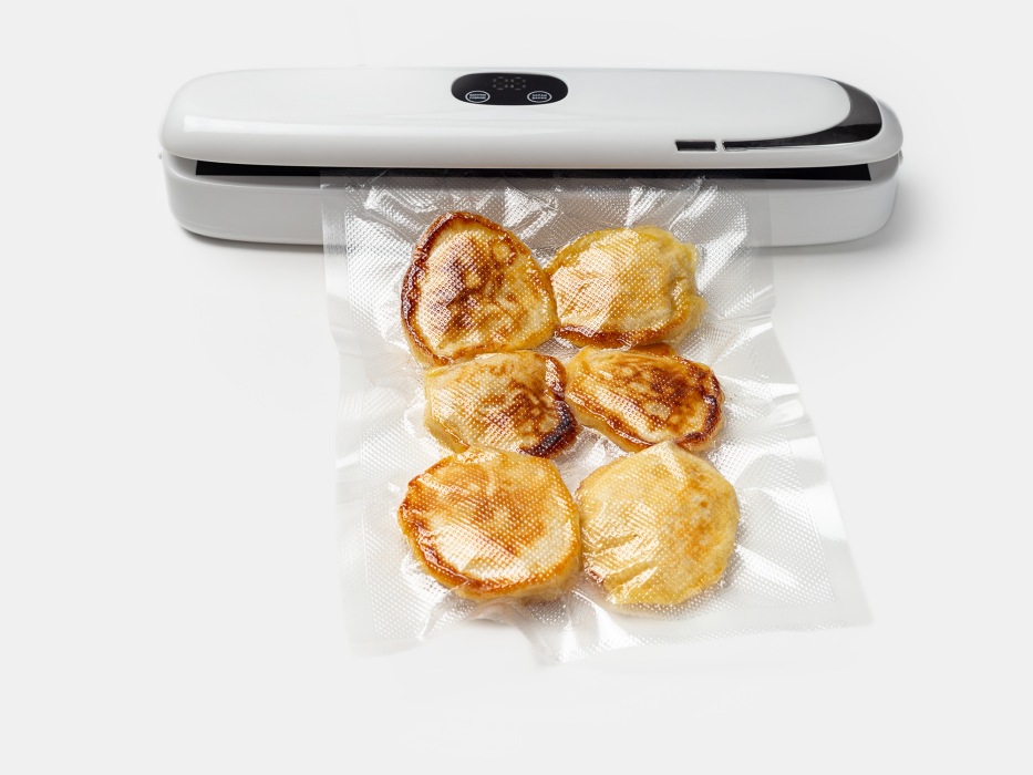 Заморозить готовые оладьи в контейнере, переложить в пакет и с помощью вакууматора удалить воздух, запечатать и заморозить.