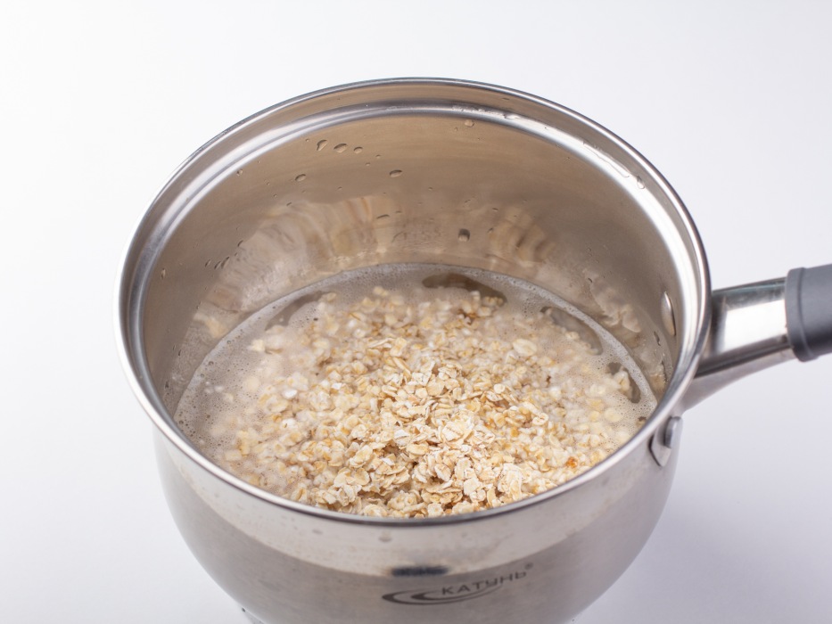 Закипятить воду в кастрюле и добавить туда овсяные хлопья.