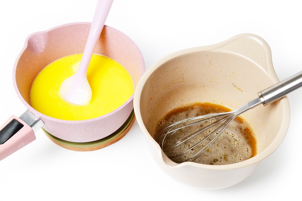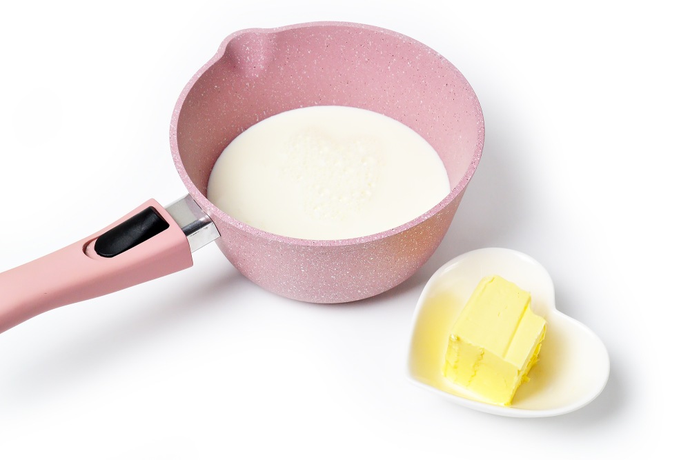 Подогреть молоко на среднем огне – буквально до 40-50 градусов. Добавить в него сливочное масло и перемешать, чтобы полностью растаяло.