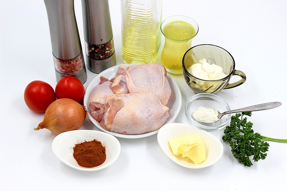Подготовить ингредиенты для классического паприкаша из курицы по-венгерски.