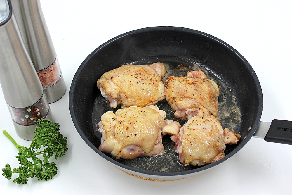 Посолить, поперчить бедрышки и обжарить с двух сторон, на смеси сливочного и растительного масла.