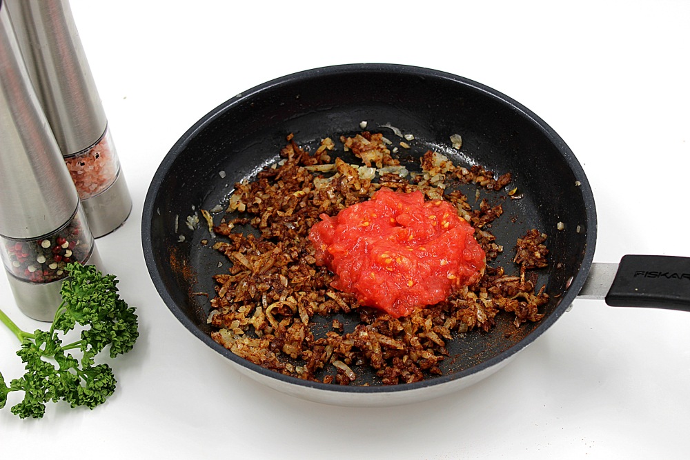 Перемешать и добавить измельчённые томаты.