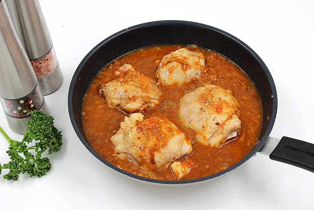 Вернуть курицу, закрыть крышкой и довести её до готовности, около 40 минут на минимальном огне.