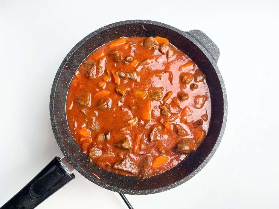 Рецепт простой, но есть несколько важных моментов. Обязательно обсушите мясо и обжаривайте его небольшими порциями на сильном огне — так появится румяная корочка, а сок останется внутри. Ещё один совет: вместо томатной пасты лучше брать томатный соус или протёртые томаты — у них вкус мягче, и подлива получается приятнее.