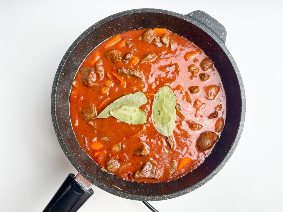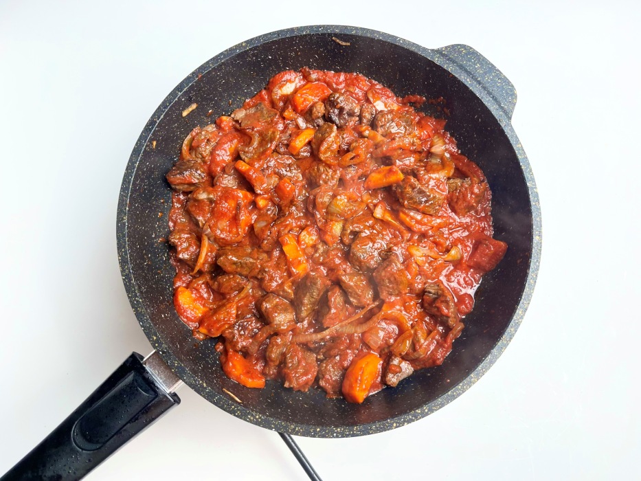 Главное в этом блюде — не техника, а терпеливое томление. Чем дольше соус готовится на слабом огне, тем мягче становится говядина. Рецепт универсальный: по той же схеме можно приготовить соус с курицей, свининой или бараниной — всё выйдет вкусно. Для говядины лучше всего подходит лопатка или грудинка, особенно куски с небольшими жировыми прослойками.
