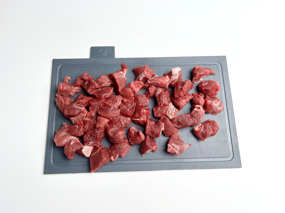 Подготовить мясо. Вымыть и хорошо обсушить говядину бумажными полотенцами. Удалить жилки и пленку. Нарезать на средние куски 3-5 см толщиной.