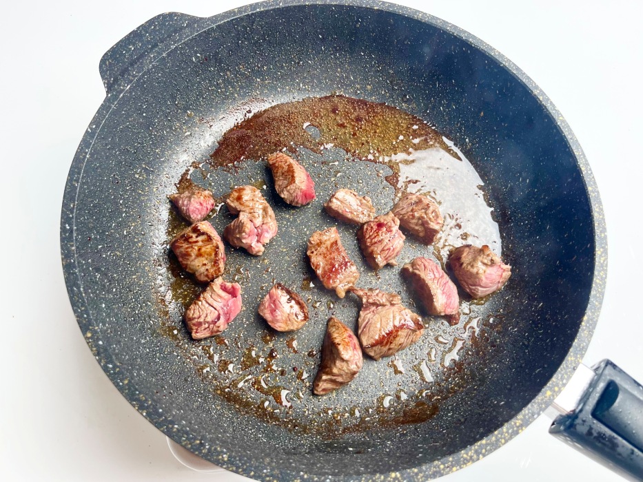 В глубокой сковороде разогреть масло. На сильном огне обжарить говядину небольшими порциями со всех сторон, до румяной корочки. Если выложить всю говядину сразу, и куски будут плотно прилегать друг к другу, то не получится зажаристой корочки, не запечатается сок внутри. По готовности убрать мясо в отдельную емкость.