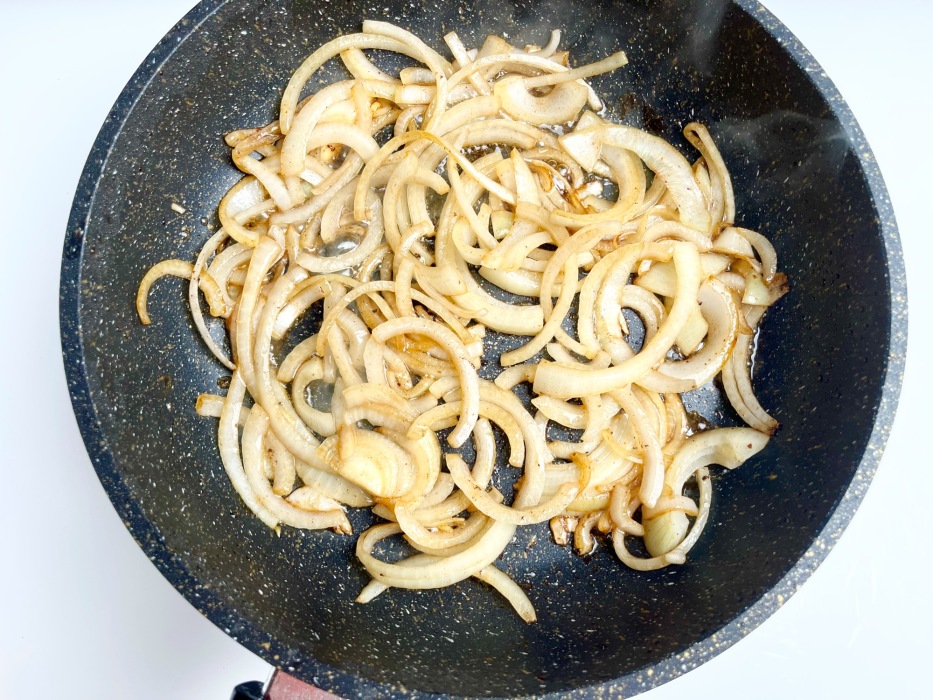 На том же масле, но уже на среднем огне, обжарить лук до золотистого цвета, помешивая. На этой уйдет примерно 3-5 минут.