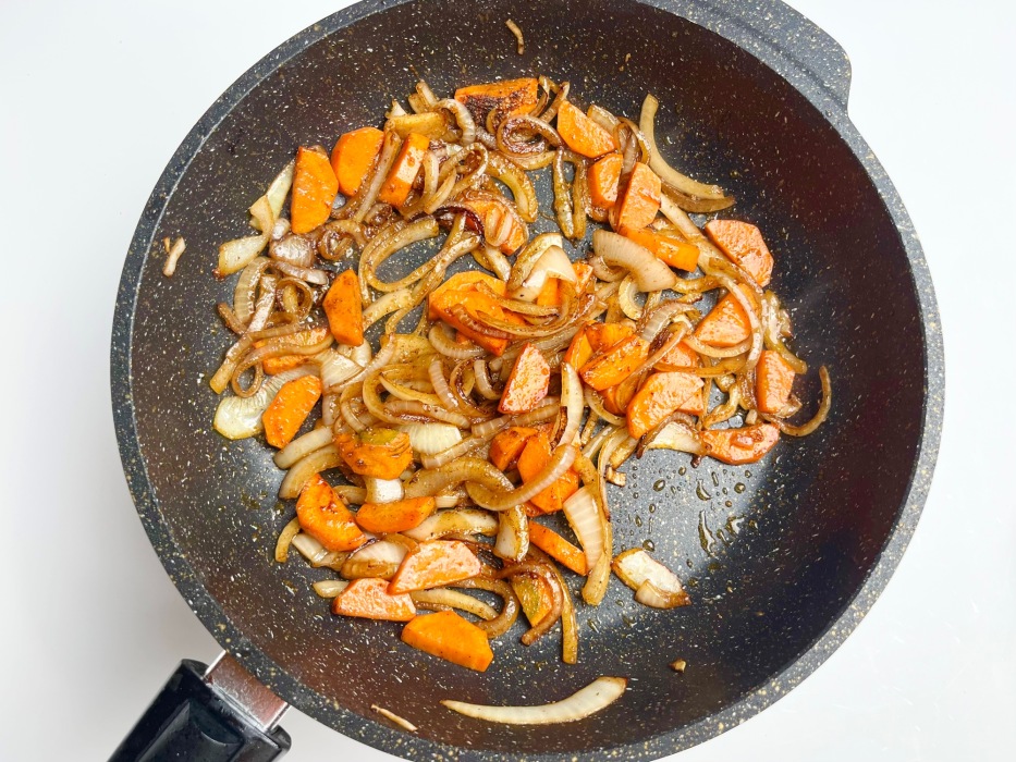 Добавить к луку морковь и специи (чеснок, перец и паприку), перемешать, обжарить в течение 3 минут.