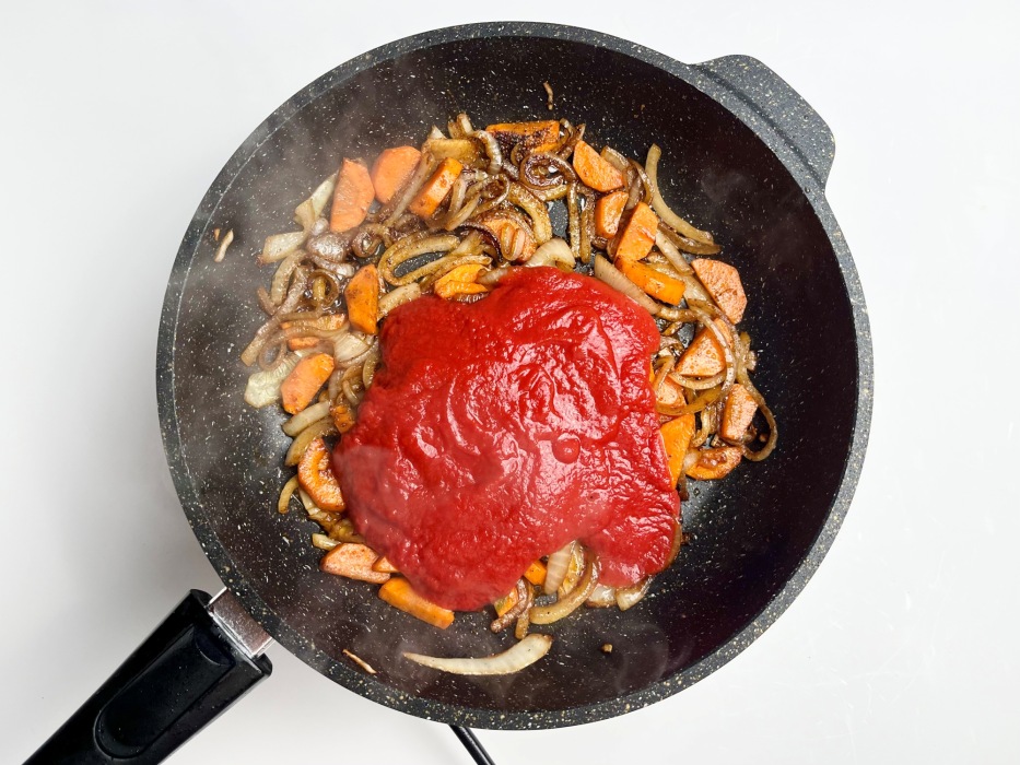 Добавить томатный соус. Хорошо перемешать и прогреть на огне еще 3 минуты.