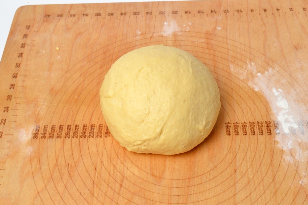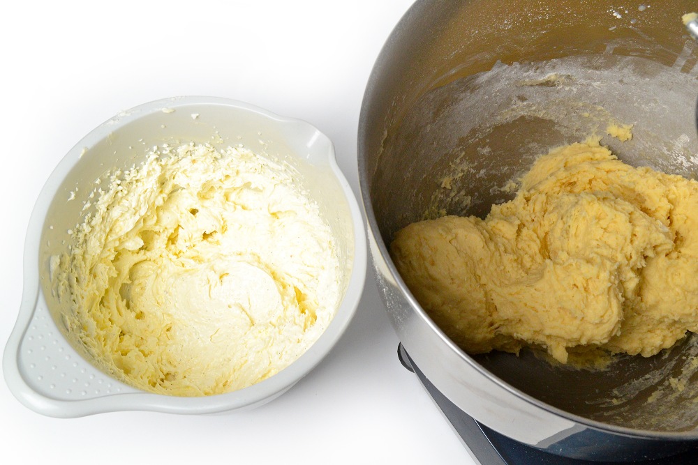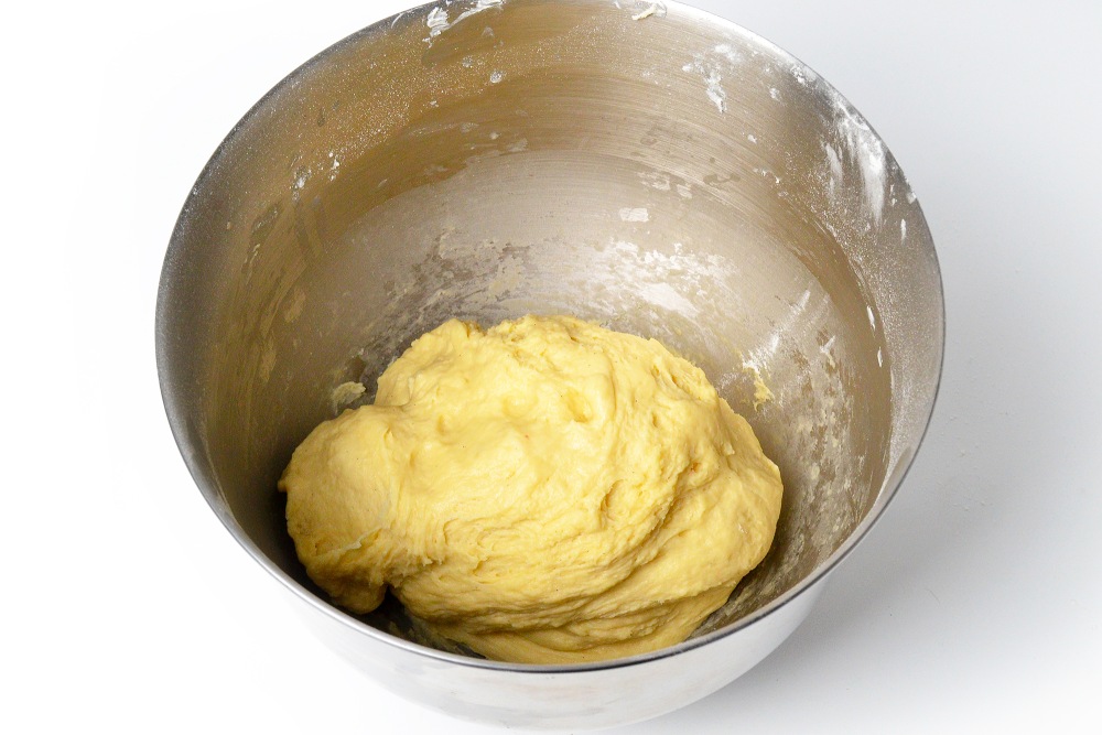 Когда тесто соберется в неоднородный комок, добавить взбитое сливочное масло. Снова перемешать крюком на средней скорости или чуть ниже.