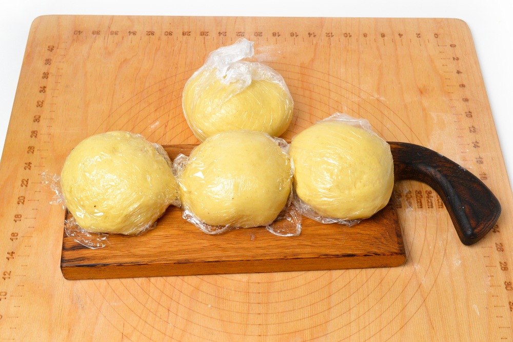 Разделить на 4 части примерно по 300 г и убрать под пленку или разложить по пакетам. Оставить на 10-15 минут.