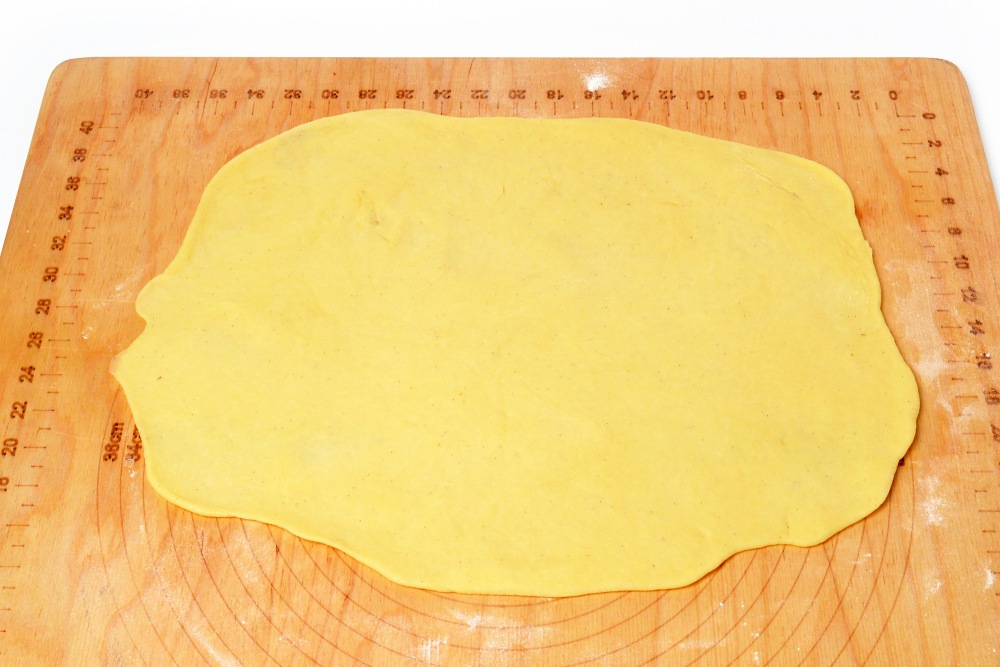 Раскатать тесто в прямоугольный пласт толщиной 3-4 мм.