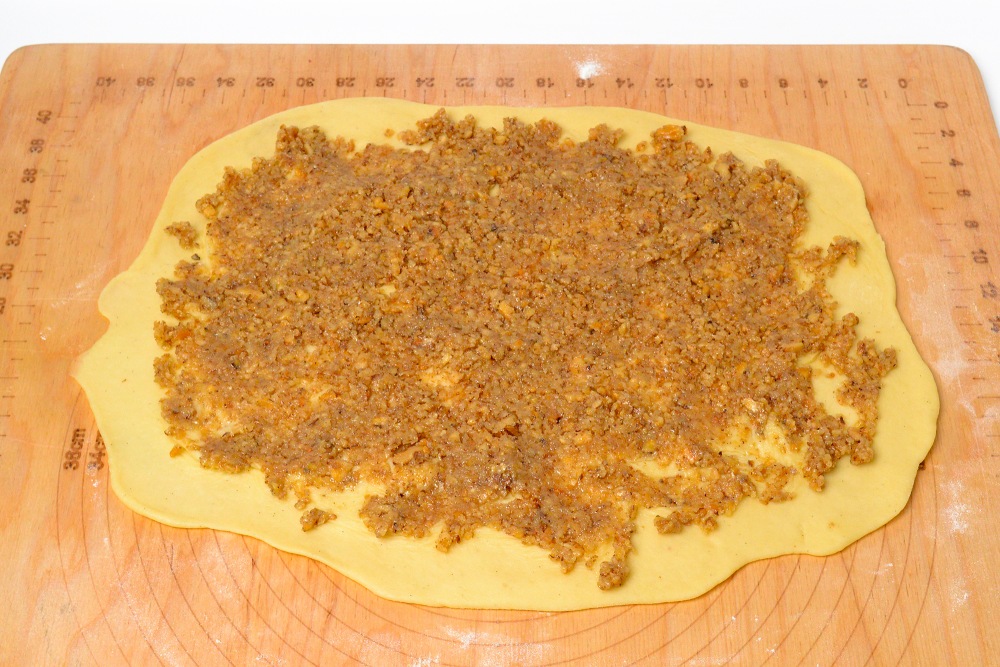 Выложить ореховую начинку, отступая 1-2 см от краев. Разровнять.