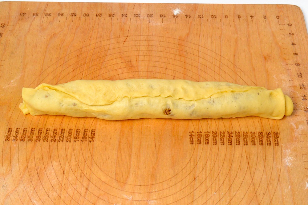 Свернуть в улитку, подгибая разрезанный край вниз под кулич, а неразрезанный край утапливая в центр. Если не уплотнить эти зоны, то кулич может сильно развернуться.