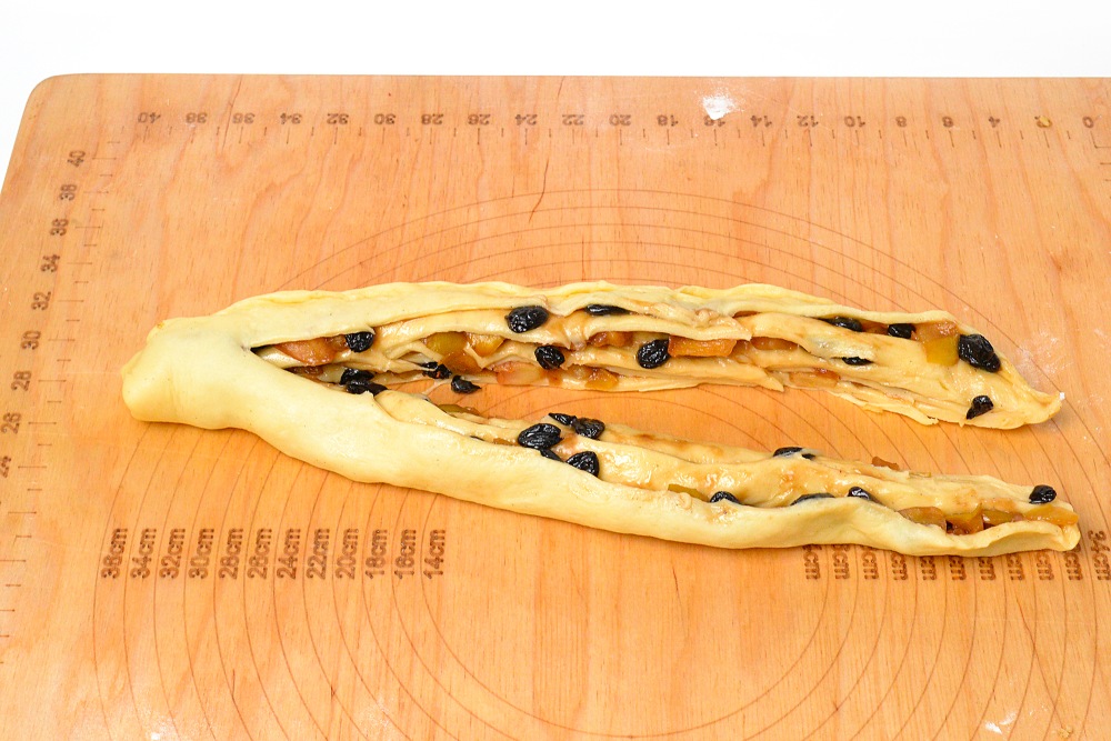 Важно: так как яблочная начинка более жидкая, не плотная, то работать с ней сложнее. Поэтому плотным слоем выкладывать ее не следует.