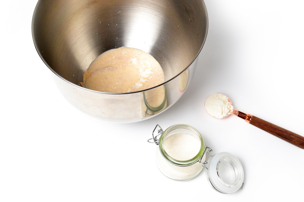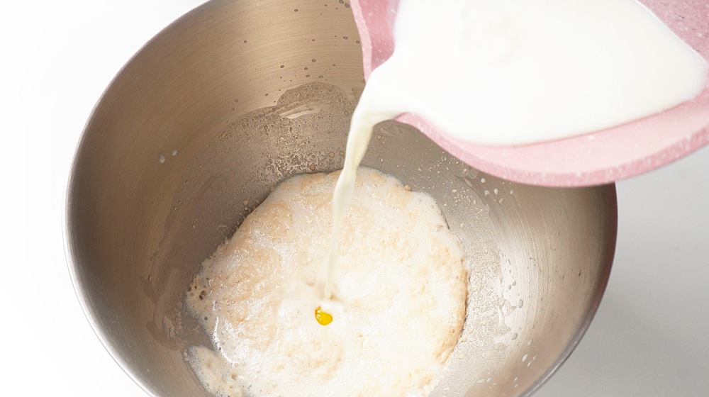 В чашу, в которой будет замешиваться тесто, добавить дрожжи и залить половиной теплого молока. Туда же положить немного сахара, пару ложек муки.