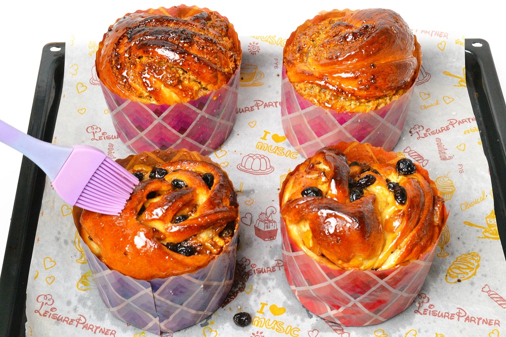 Сделать проколы в 4-5 местах сверху кулича, используя шпажку. Готовые горячие куличи пропитать сиропом – сделать 2-3 прохода, щедро добавляя сладкую смесь.