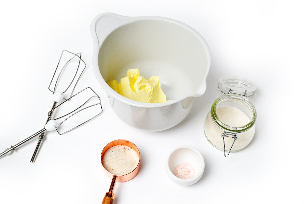 Отдельно взбить масло с сахаром, ванильным сахарам и солью.