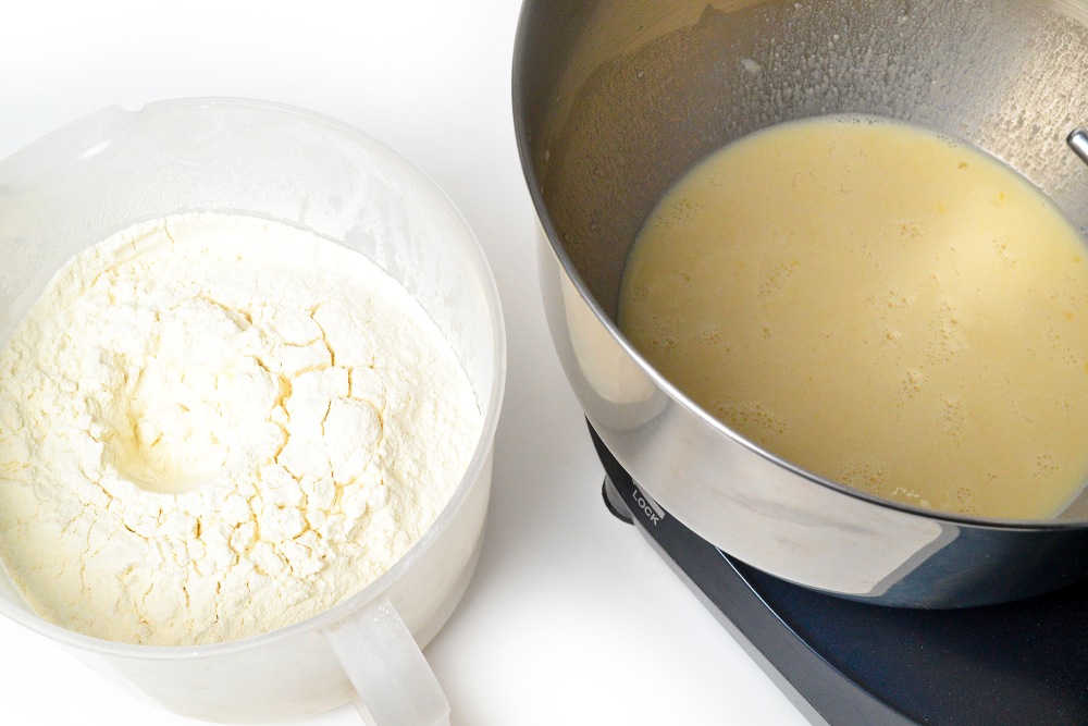 Частями добавить муку – примерно ¾ от общего количества, вымешивая планетарным миксером с насадкой-крюком или вручную.