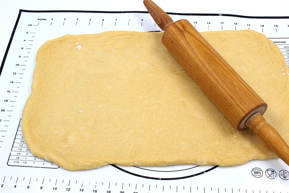 Припылить поверхность мукой и раскатать тесто в прямоугольник, примерно 40\25 см.