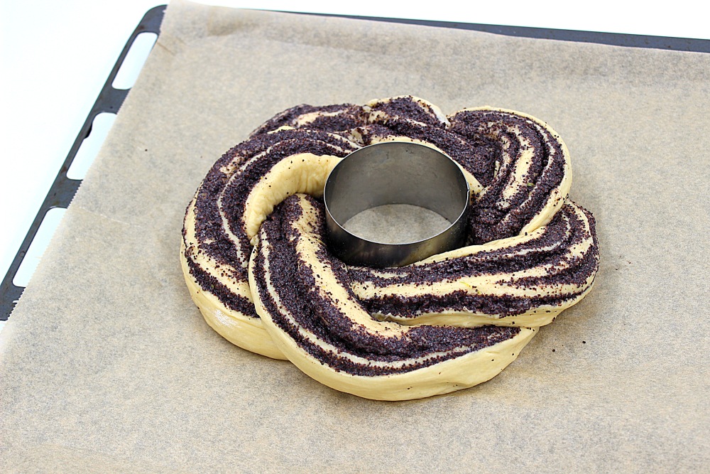 Противень застелить бумагой для выпечки, аккуратно перенести плетенку, формируя круг. Края соединить, а в середине поставить небольшую форму.