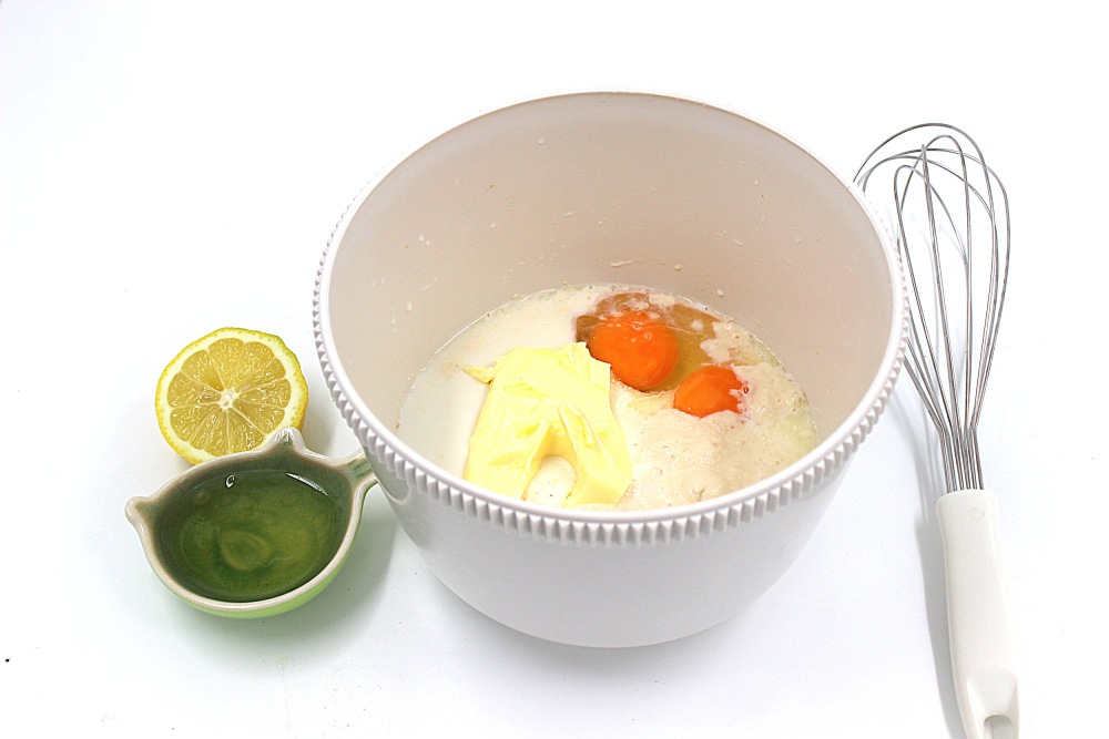 Сразу распределите ингредиенты, что бы после не запутаться. Отделите 30 грамм сливочного масла, одно яйцо на белок и желток, 300 мл молока. Перечисленные масло, белок и молоко - всё это для начинки.