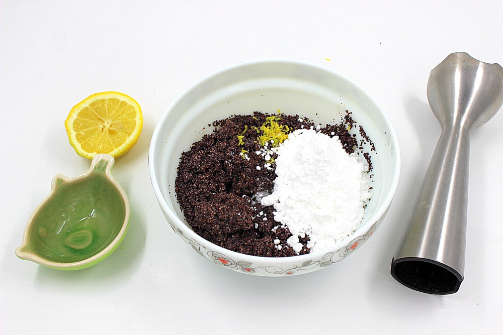 К маку добавить немного натертой цедры, 50 г сахарной пудры и 1 белок.