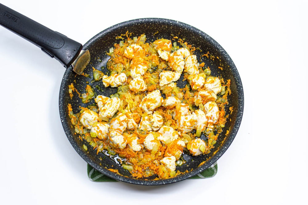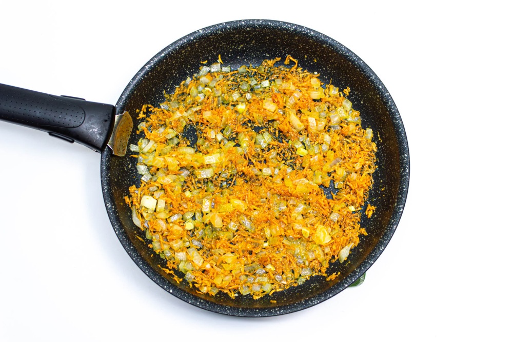 Нарезанный лук и морковь должны стать мягкими и прозрачными (обжарка займет около 5–7 минут на среднем огне).