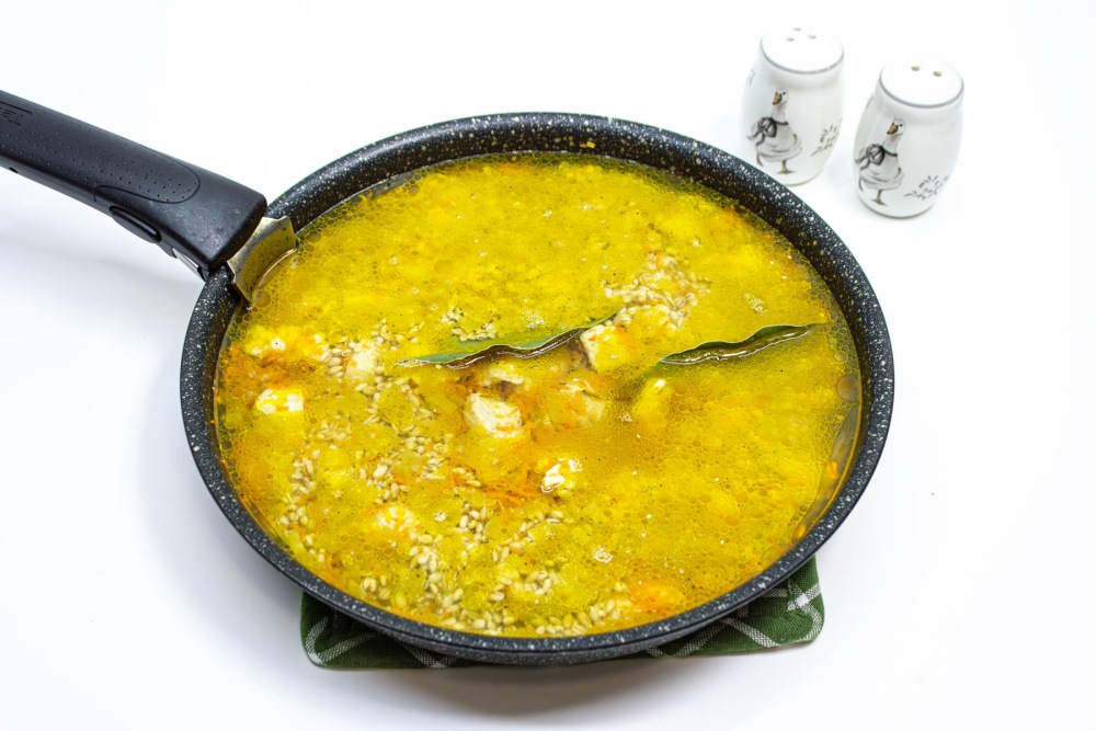 Налить горячую воду или мясной бульон так, чтобы уровень жидкости покрывал содержимое сковороды примерно на 1–1,5 сантиметра сверху. Довести до кипения.