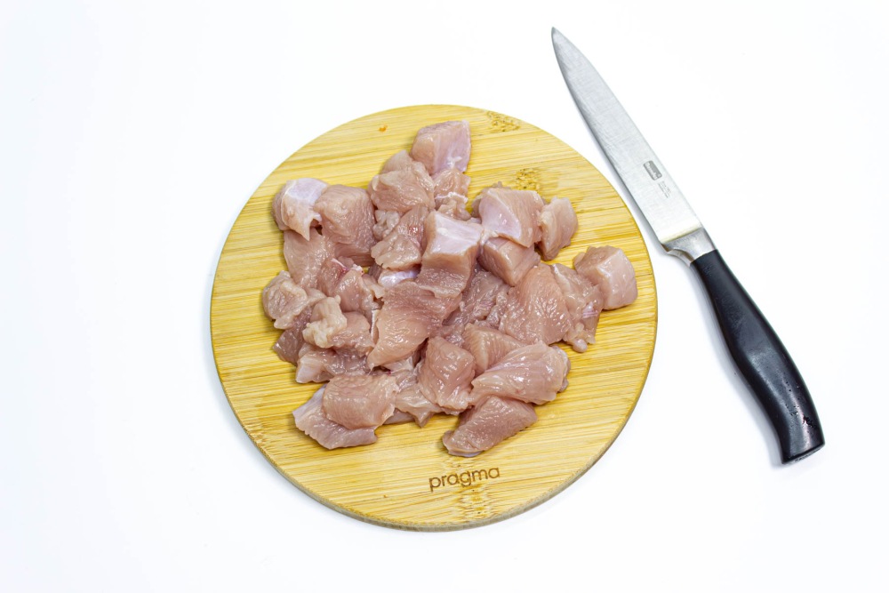 Нарезать мясо индейки (у меня грудка) кубиками среднего размера (примерно 2×2 см).
