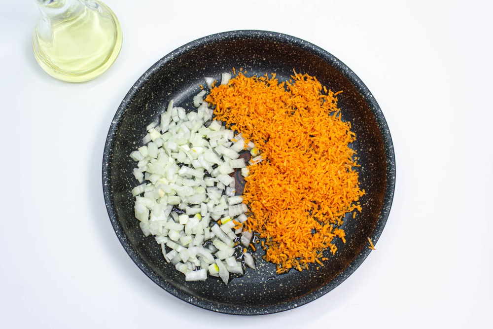 Добавить лук и морковь в сковороду с маслом и обжарить на среднем огне.