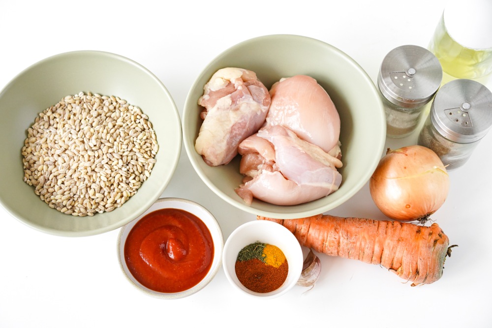 Подготовить ингредиенты. В этом рецепте лучше использовать филе бедра, оно остаётся сочным даже после длительного тушения и придаёт блюду насыщенный вкус. Перловку стоит выбирать с крупными цельными зёрнами, без пыли и мусора. Протёртые томаты можно заменить ложкой томатной пасты, разведённой небольшим количеством воды, вкус получится чуть ярче и насыщеннее. При желании добавить немного сушёных трав, они подчеркнут аромат.
