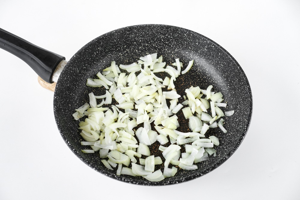 Лук очистить от кожуры и нарезать тонкой соломкой или мелкими кубиками - как вам привычнее. В глубокой сковороде или сотейнике разогреть немного растительного масла. Выложить лук и обжаривать на среднем огне 3–4 минуты, помешивая, пока он не станет мягким и слегка прозрачным. Именно на этом этапе появляется тот самый аппетитный аромат, который будет основой для всего блюда.