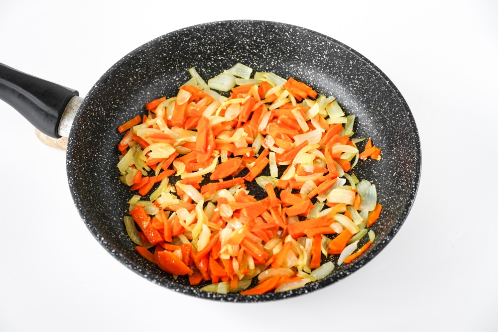 Морковь вымыть, очистить овощечисткой и нарезать небольшими брусочками или натереть на крупной тёрке - в зависимости от того, хотите ли вы ощущать её текстуру. Добавить морковь к луку и жарить вместе ещё 5 минут. За это время овощи станут мягкими и приобретут красивый золотистый оттенок, а вкус - более сладкий и насыщенный.