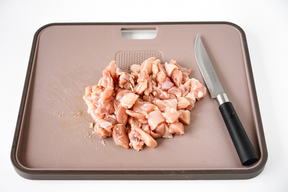Филе бедра промыть под прохладной водой, промокнуть салфеткой, чтобы убрать лишнюю влагу, так мясо лучше обжарится. Нарезать на небольшие кусочки, удалить излишки жира, если есть.