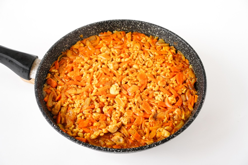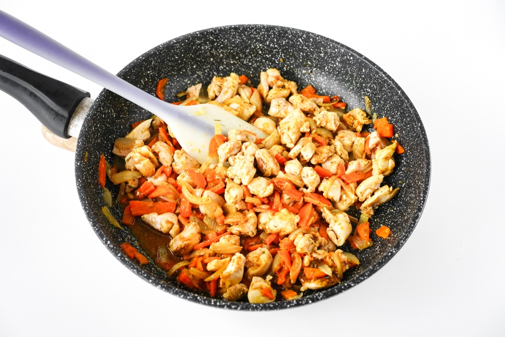 Выложить курицу к овощам и обжаривать 5–7 минут.
