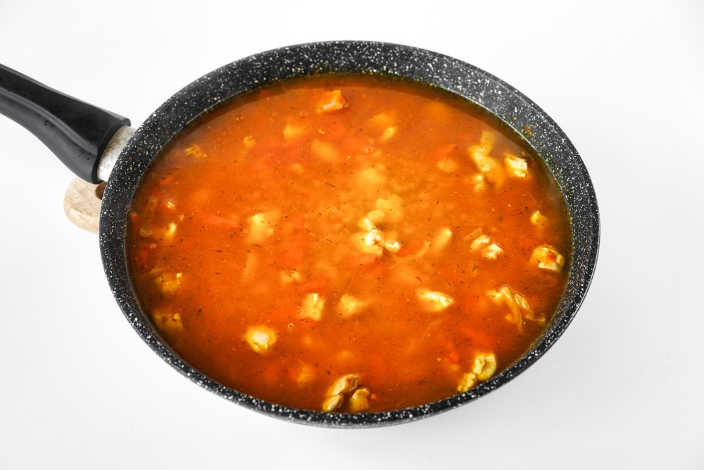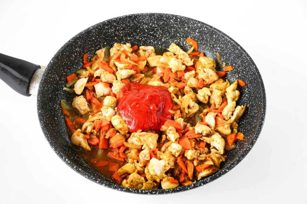 Курица делает блюдо питательным, но не тяжёлым. Лучше всего подойдёт филе бедра или грудка - мясо получается мягким и не пересушивается. А для дополнительного аромата добавим специи и немного протертых томатов.