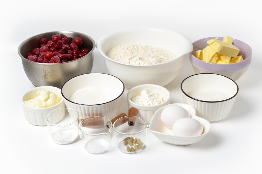 Подготовить ингредиенты: замороженные ягоды достать заранее, а сливочное масло, сметана и яйца, напротив, должны быть холодными. Указанного количества достаточно для формы диаметром 28 см.