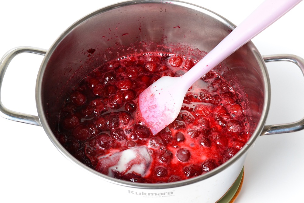 Снять с огня, когда масса начнет густеть. Как видно, крахмал с водой меняет оттенок с белого на прозрачный, точнее, приобретает цвет ягод.