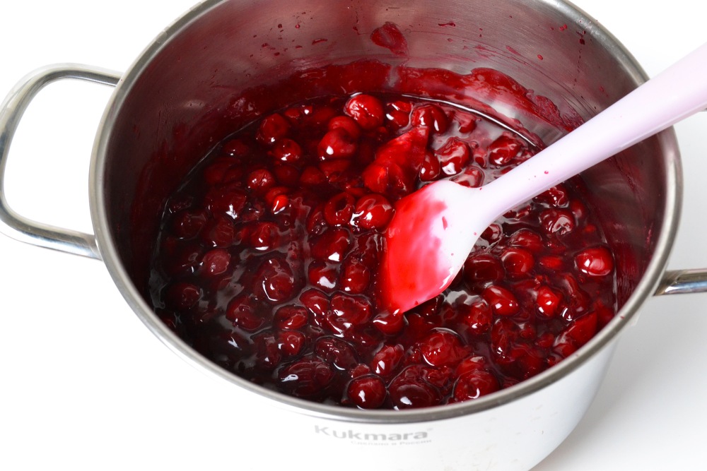 Подготовить начинку: в кастрюлю или сотейник отправить вишню, сахар и специи. Сладость вишни может отличаться, регулируйте количество сахара по вкусу.