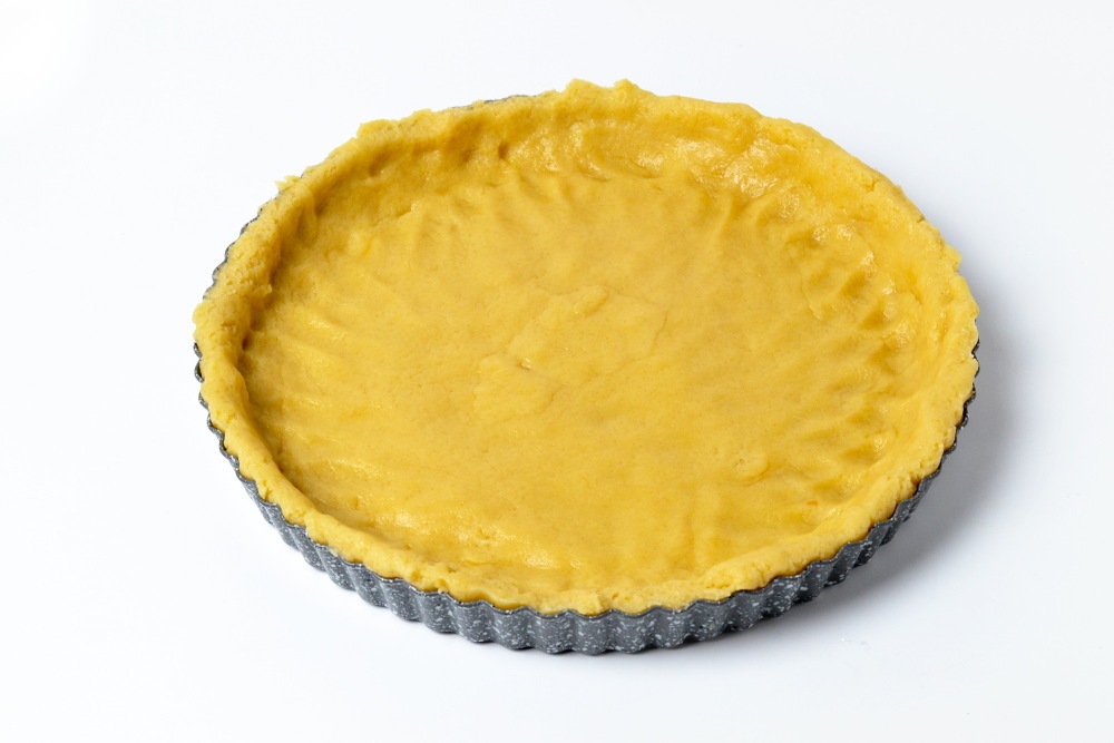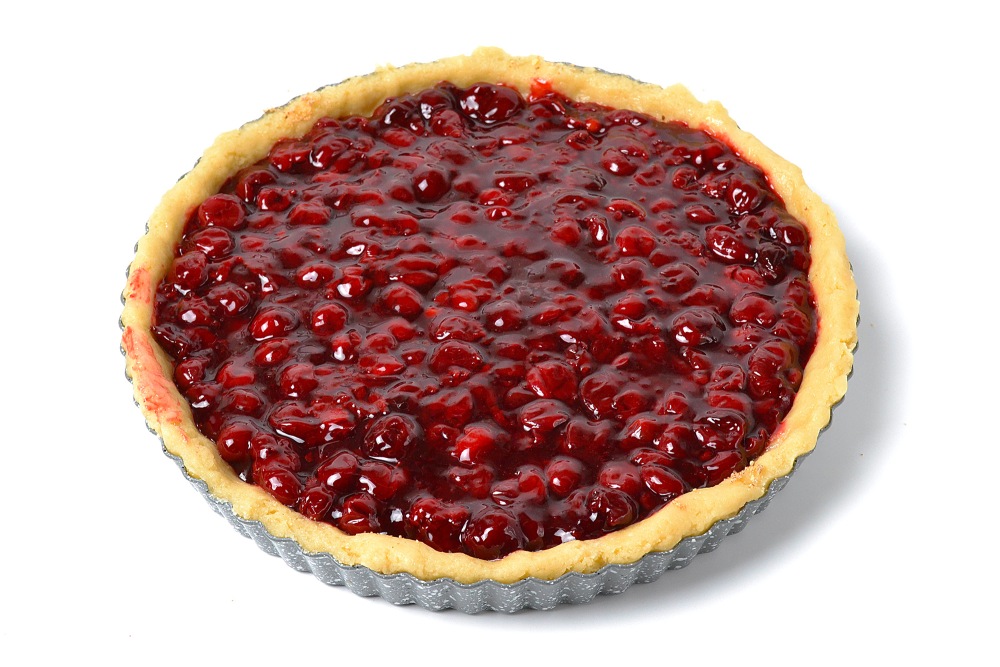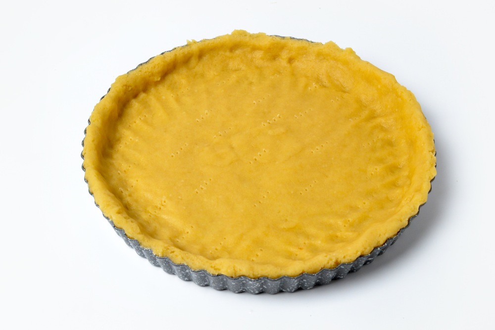 Вылить начинку на заготовку для песочного пирога с ягодами.