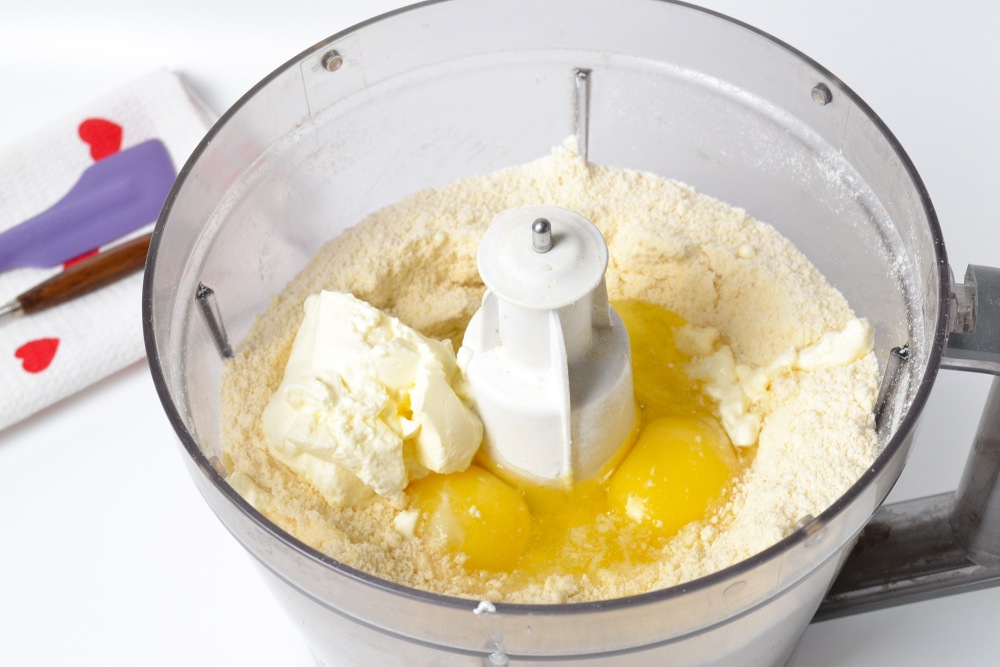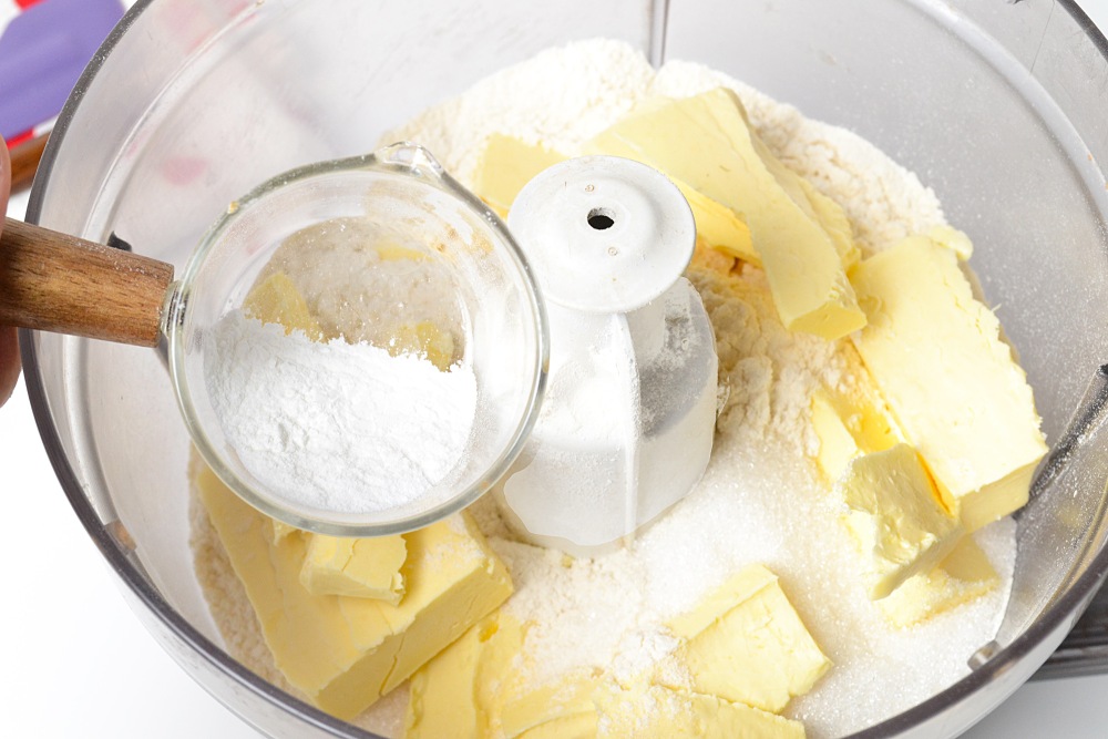 В комбайн высыпать муку, добавить сахар и холодное сливочное масло. Всыпать соль с ванилином и разрыхлителем. Включить на 40-60 секунд, чтобы все смешалась в однородную крошку.