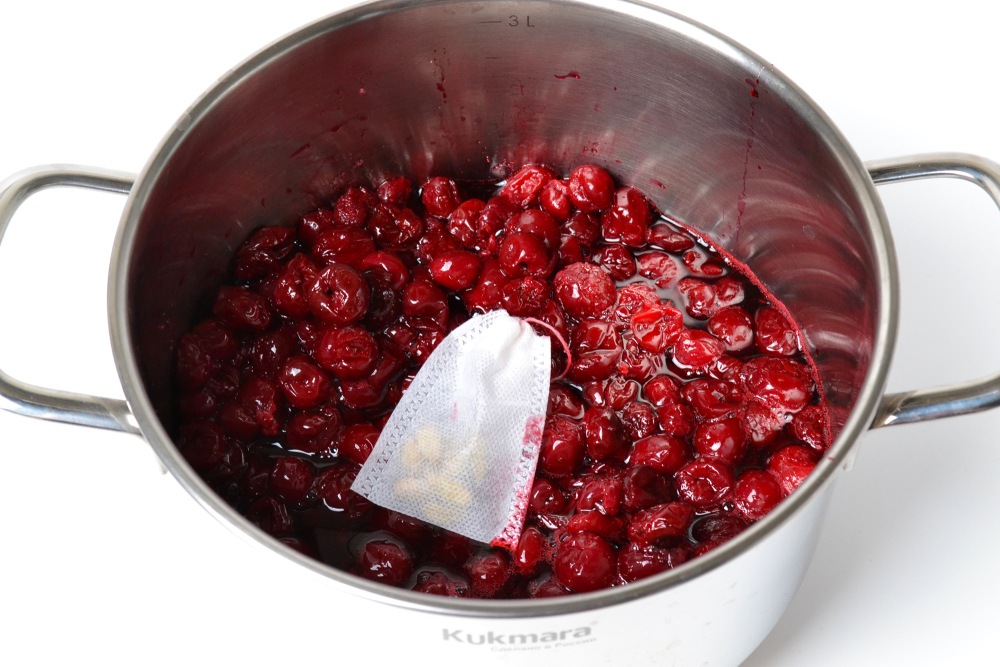 Соединить в кастрюльке вишню, сахар, кардамон и поставить на средне-сильный огонь, довести до кипения.