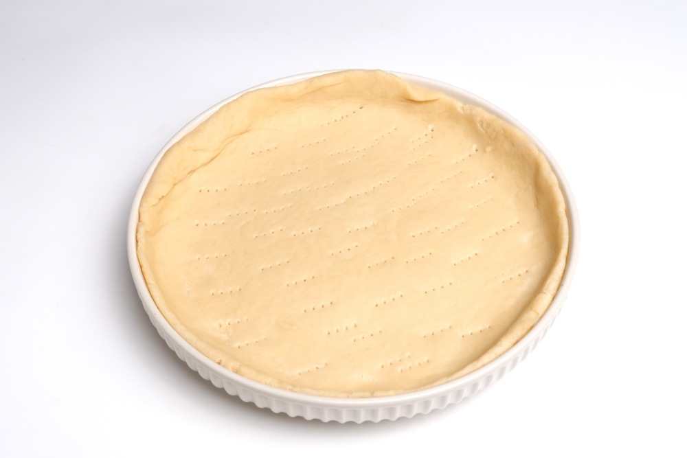 Тесто раскатать тонко, выложить на противень или в форму для запекания Проколоть поверхность вилкой. Духовку разогреть до 190 градусов.