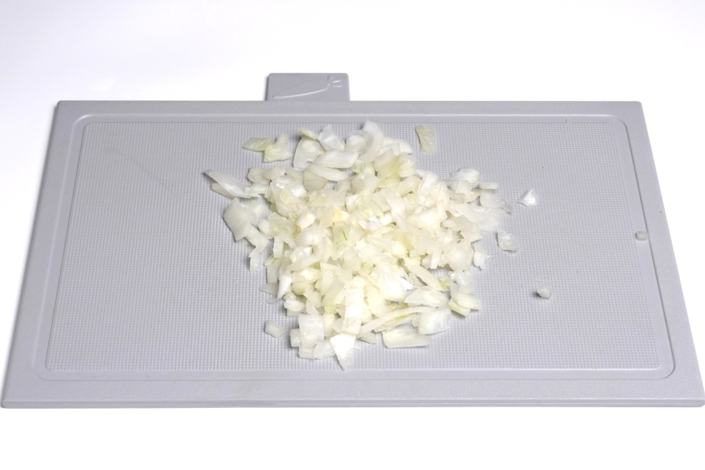 Лук очистить и мелко нарезать. Если глаза очень слезятся, смочите нож холодной водой.