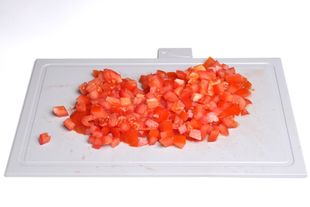 Помидоры нарезать мелким кубиком. По желанию, можно удалить кожуру с помидоров, подержав их в кипятке пару минут. Если помидоры очень сочные, семена и жидкость лучше удалить, чтобы пицца не “поплыла”.