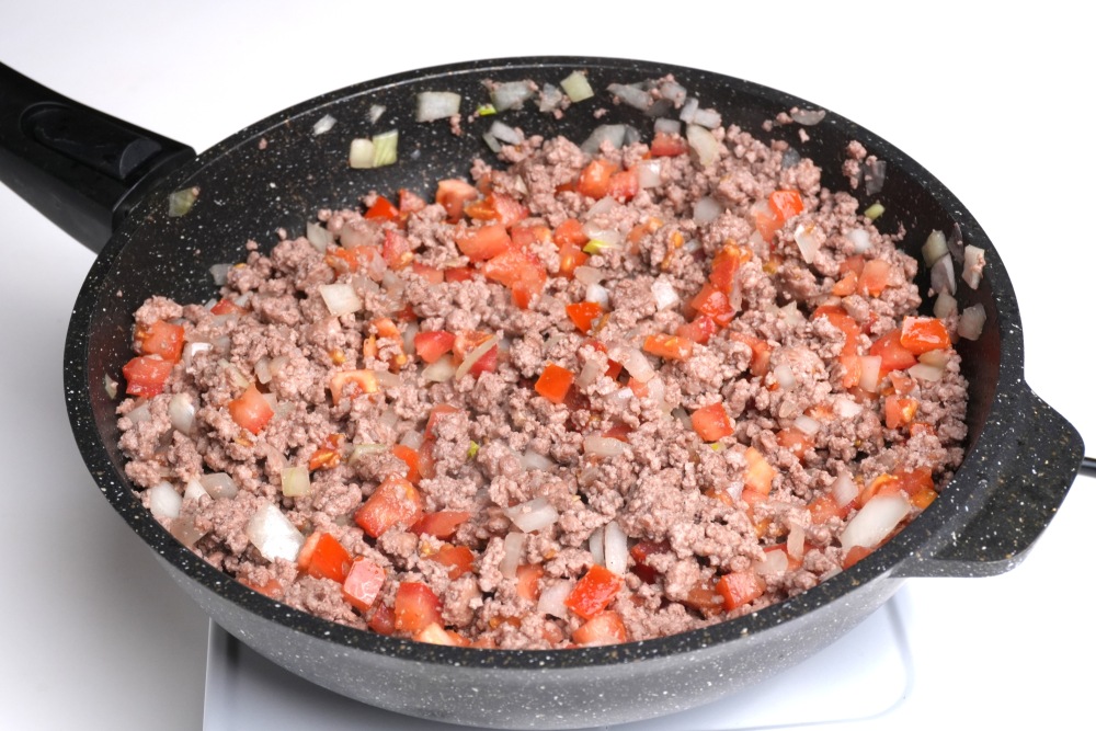 Добавить в начинку помидоры, посолить, поперчить. Перемешать и обжаривать еще 3 минуты. Оставить начинку остужаться.