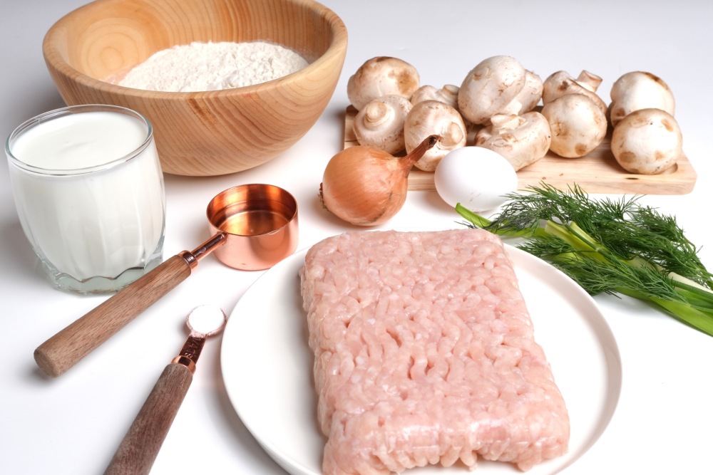 Подготовить все ингредиенты для заливного пирога с куриным фаршем. Фарш должен быть хорошо разморожен, мы будем его обжаривать, и он не должен дать лишнюю влагу. Кефир и яйца лучше брать комнатной температуры. Духовку разогреть до 180 градусов, режим верх-низ. Из посуды нам понадобятся сковорода для начинки, глубокая миска для замеса и плоская форма для выпечки.