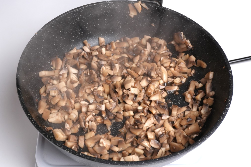 Шампиньоны должны уменьшиться примерно в два раза. На дне еще должно остаться немного влаги, полностью ее выпаривать не нужно - она дает начинке сочность.